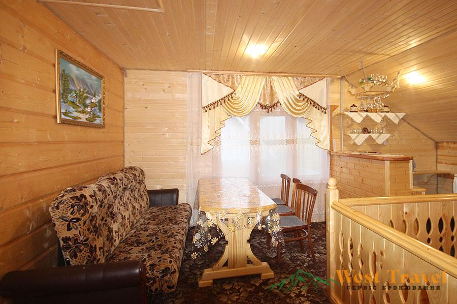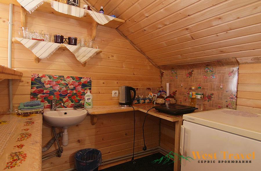 На другому поверсі — хол (розкладний диван, стіл, телевізор, кухонний куток — електрична плита, холодильник, електрочайник, мийка, необхідний посуд);