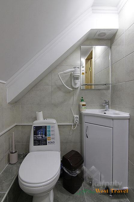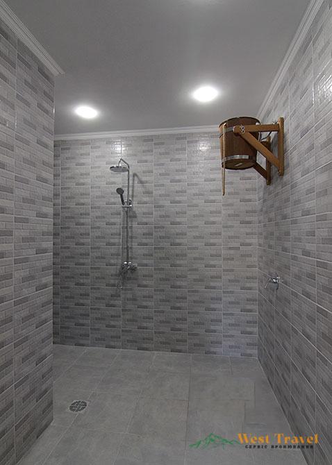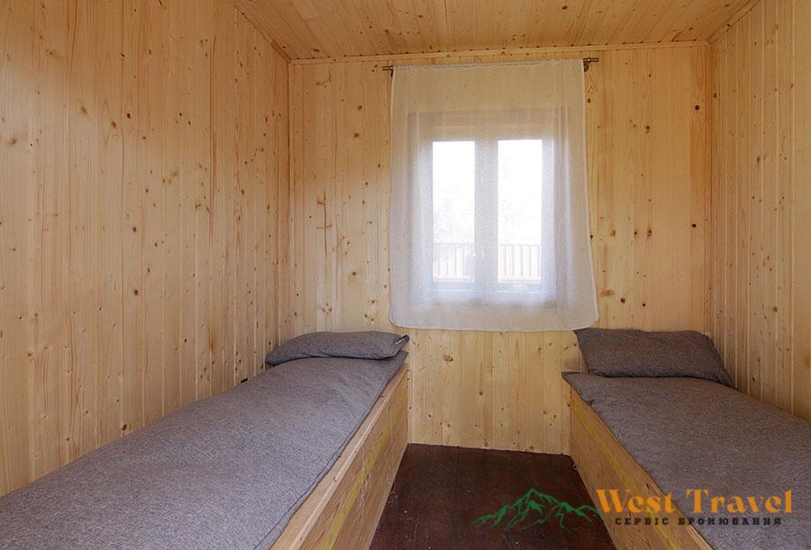 Двомісний — двоспальне ліжко, шафа для одягу, телевізор, холодильник; санвузол на поверсі (душова кабіна, туалет, умивальник, фен).