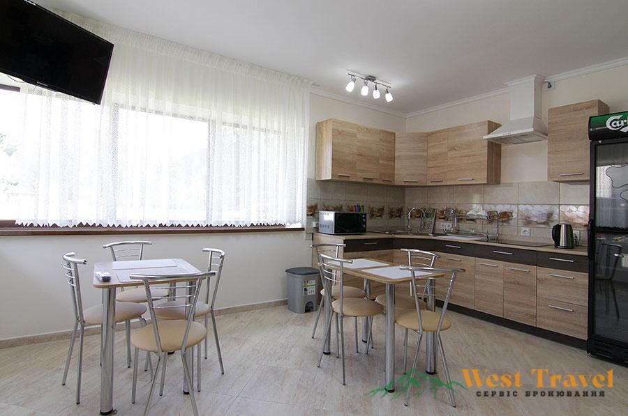 Можна самостійно готувати їжу на кухні (електрична плита, мікрохвильова піч, холодильник, електрочайник, мийка, посуд, обідні столи, телевізор, камін).